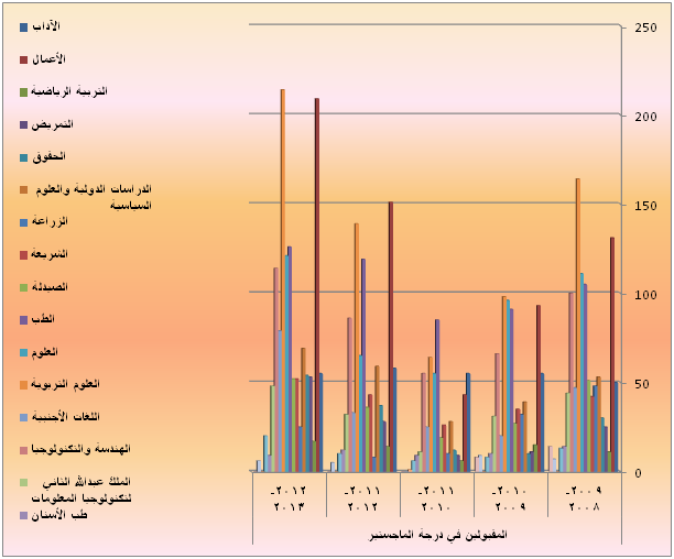 بلغ مجموع الطلبة المقبولين في برامج الدراسات العليا (الماجستير والدكتوراه) في الاعوام الجامعية بين 2008-2009 الى 2012-2013 حوالي (5682) طالب وطالبة موزعين بناءً على الكلية كما يلي: